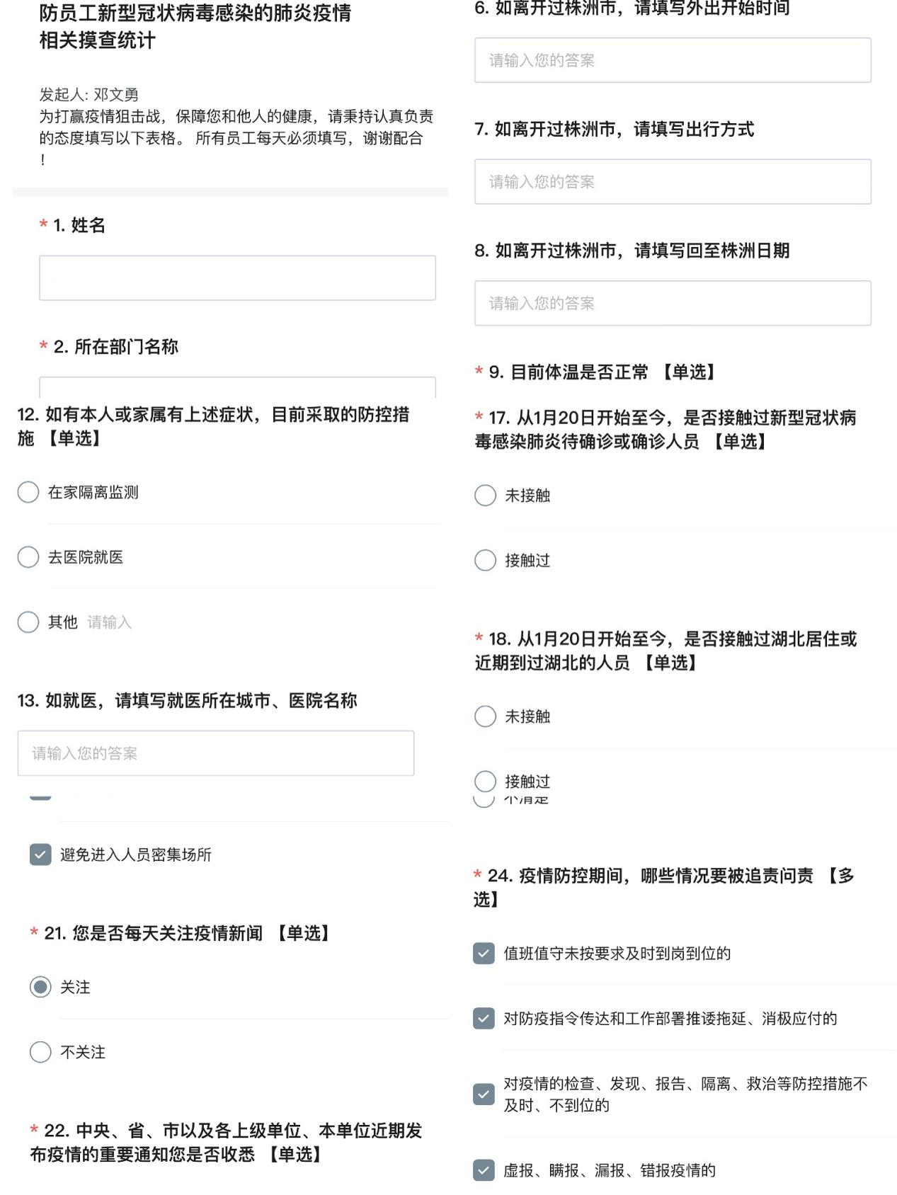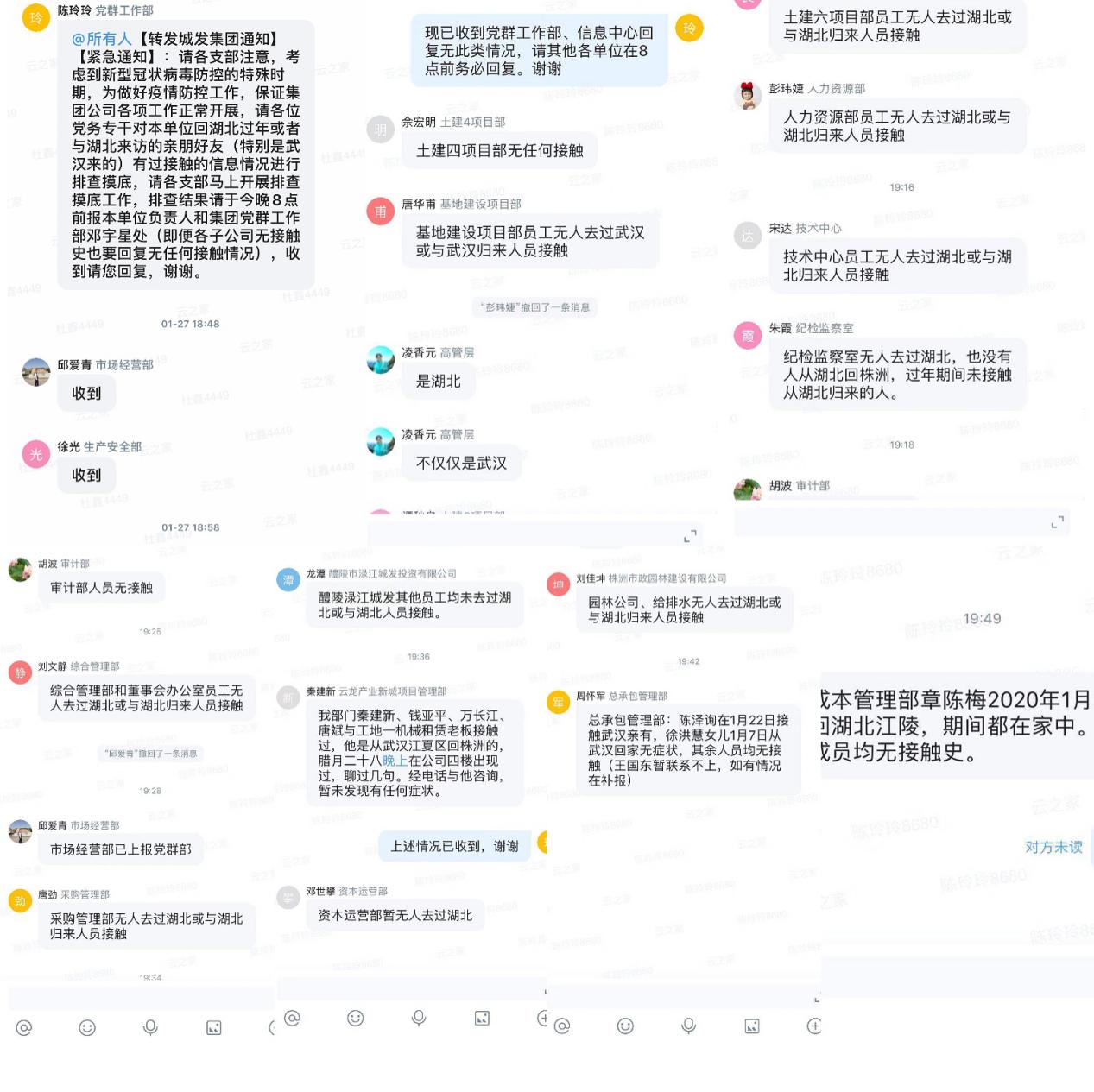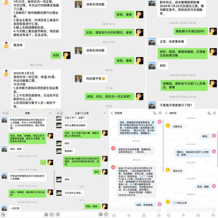 在疫情病例不断增多的情况下,国信建设人谨遵不聚集原则,充分利用智慧化手段,创新开展“互联网+疫情信息报送”工作模式。1月27日,进行了第一次网上全面排查,对公司回湖北过年或者与湖北来访亲属朋友有过接触史的同志逐一进行摸底排查,经排查,目前未出现疑似病例。对摸排发现有接触史的人员安排专人每日跟踪、反馈,做好疫情防控报备工作。为进一步掌握公司员工每日动态及对疫情防控工作有关纪律要求,摸底排查工作组于1月29日迅速制定出《疫情排查工作调查问卷》,督促全司内每位员工于每日12:00前填写完成,切实加强宣传,提高员工自我防护意识。连日来,根据调查问卷的反馈情况,截止到目前为止,共有44人有过湖北出入和亲朋好友走访的情况记录,经每日跟踪调查,并未发现有疑似或确诊情况发生。