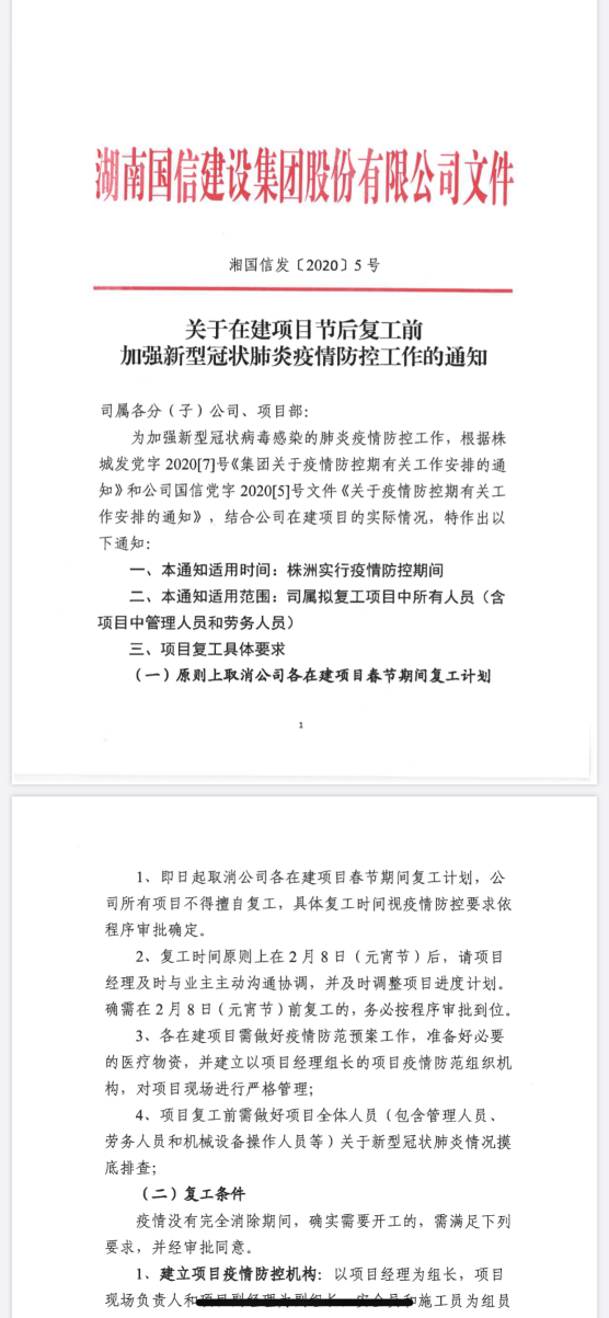 国信建设党委严格按照省委、市委、集团关于项目建设复工要求,1月30日上午,公司领导通过视频会议商定项目建设复工时间。2月1日,根据省委最新复工文件精神要求,公司对项目建设复工时间再次进行调整。要求所有建设项目和施工项目的复工时间不得早于2月9日24时,在2月9日后疫情防控期间开工、复工的工程项目,必须按照复工要求依程序报批。生产安全部将全面摸排工程项目的开工、复工情况,做好沟通和宣传工作,做到项目全覆盖无遗漏。