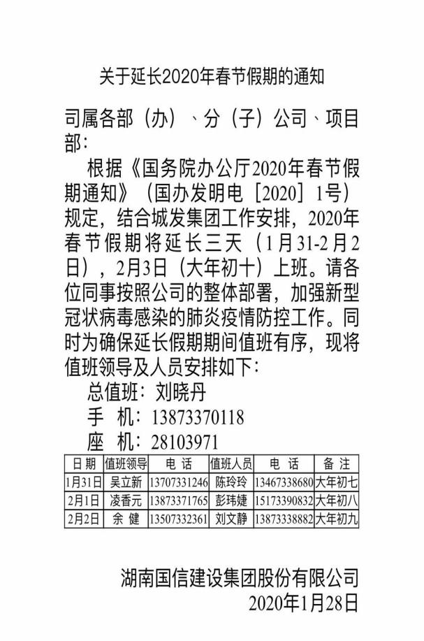 国信建设一方面以调查问卷为载体,深入学习贯彻市纪委、市委组织部联合下发的《关于进一步严明疫情防控工作纪律的通知》。另一方面,按照市委2月1日晚会议精神,春节假期延长至2月9日,为强化值班值守,督促防控举措落实落细,公司每天安排1位班子成员与1名部门负责人进行值班,对各项目进行督查,杜绝出现疫情防控不到位及擅自开工等情况发生。同时,为打好疫情防控阻击战,为给复工后公司本部人员呈现更干净、更健康的工作环境,已安排专人每日对公司办公大楼的办公场所、走廊、楼梯间进行全面消毒;防控口罩、消毒液、酒精、红外测温仪等物资均在紧急筹备中,确保在公司全员复工前做好了一切准备工作。