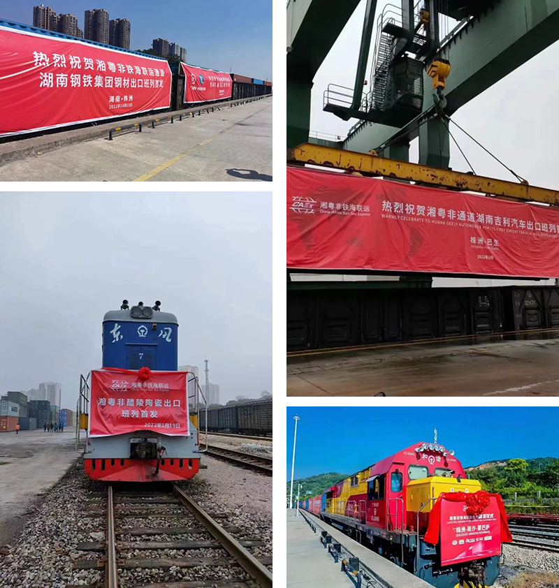 在省政府口岸办和株洲市政府的坚强领导下,湖南湘粤非国际物流有限公司(下称“湘粤非公司”)作为平台运营公司于2022年3月21日正式成立,湘粤非公司坚定平台定位,加强资源整合,推进落实各项政策,为打造湖南南向国际物流通道打下了坚实基础。2022年全年共发运19877个标箱,合计242列。2022年1月19日,醴陵南开行株洲陶瓷专列,主要发往欧美国家;2月14日,株洲本土企业兴隆新材首发,主要发往泰国、越南等东南亚国家;3月30日,开行了湘潭吉利汽车配件专列,重箱发运量1410大柜,主要发往马来西亚;并通过湘粤非铁海联运至白俄罗斯共160大柜,缓解企业出口压力;12月26日娄底--湘粤非联运班列均成功首发;岳阳的成品纸、化工品等产品通过铁路接续方式,长沙及周边的企业如三一重工、中联重科、山河智能生产的机械设备通过公路方式到株洲汇集,通过湘粤非发往世界各地。2023年1-2月共发运5629标箱,共计68列,全年计划发行400列,同比计划增长65%。
