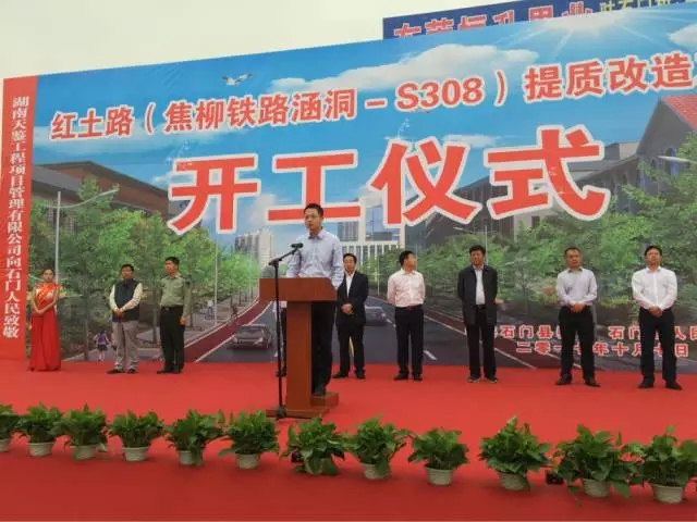 10月10日上午10时,由集团下属市政公司中标承建的石门县红土路(焦柳铁路涵洞-S308)提质改造项目开工仪式顺利举行,常德市人大常委会副主任、石门县县委书记谭本仲、石门县县长郭碧勋、市政公司总经理刘晓丹等领导参加了本次开工仪式。刘晓丹为开工仪式致辞,谭本仲宣布项目正式开工!