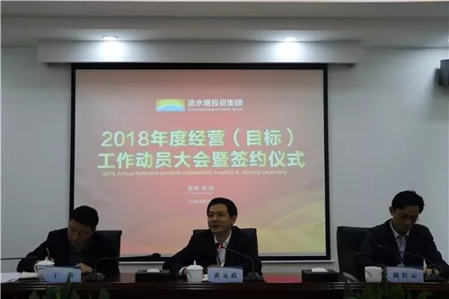 近日,集团下属清水塘投资集团召开2018年度经营目标签约仪式暨工作动员大会。清水塘集团董事长黄元政、总经理陈红云、副总经理丁勇及公司全体员工参加了本次会议,会议由陈红云主持。