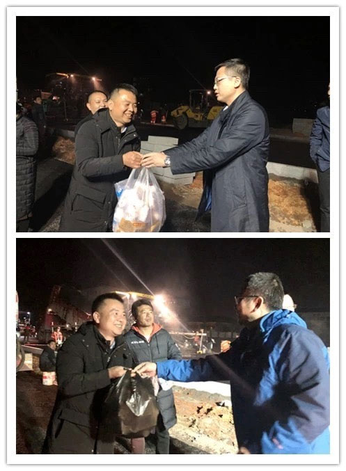 冬夜低温,下班时间,领导们仍心系一线员工,准备了面包、牛奶等物资,运送到正在连夜施工的项目现场,送到了一线员工的手中。