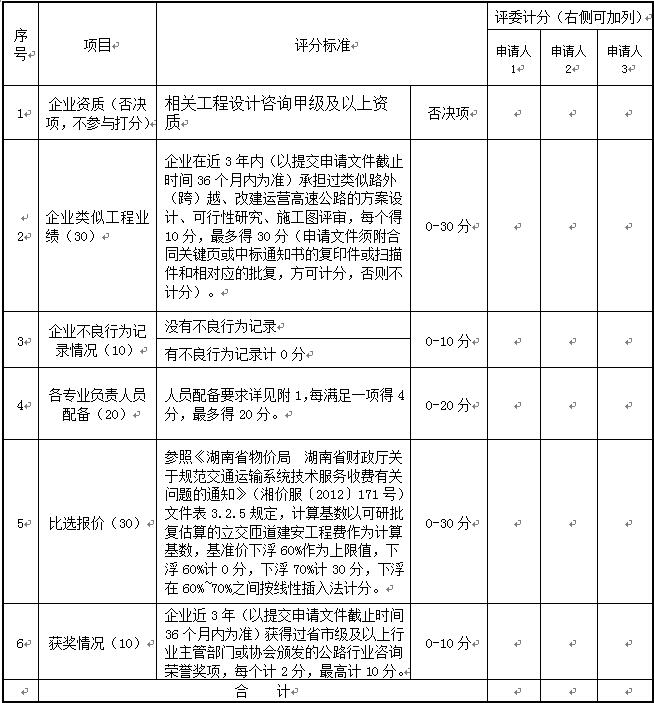 比选文件综合评分表(基本分100分)
