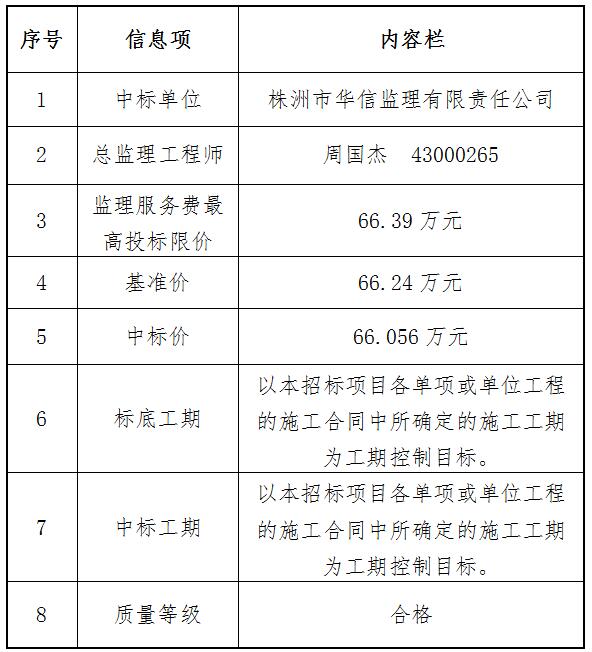 株洲南洲生态新城南阳路(原规划02号道路)一期(渌帆路至渌财路)新建工程施工监理中标结果公告