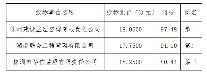 湖南信元工程项目管理有限公司受株洲市伟德国际betvlctor1946建设开发有限公司的委托,对规划148路(黄山西路-衡山中路)新建工程施工监理进行了企业公开招标,于2019年8月2日09时00分在湖南信元工程项目管理有限公司进行了开标、评标。评标委员会按照招标文件确定的评标原则和办法,对有效的投标书进行了认真的评审。经评标委员会集体评议,向业主推荐中标候选人分别如下: