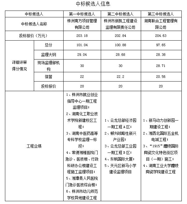 根据招标投标相关法律法规及招标文件的规定,株洲市二中附小新建工程监理评标工作已于2019年8月19日在株洲市公共资源交易中心结束,本项目采用的评标办法为(湘建监督[2018]240号文综合评估法),评标委员会推荐了以下3名中标候选人(排序/不排序),现将相关信息予以公示。公示期2019年8月21日至2019年8月23日。