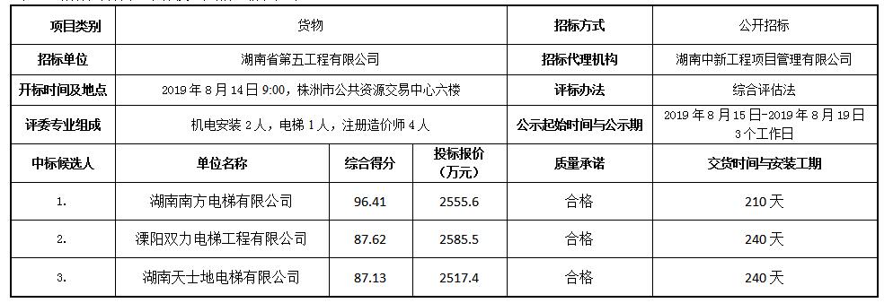 武广地标项目电梯采购及安装工程于2019 年8月 14日完成开评标,开评标全程接受 株洲市住房和城乡建设局 监督,评标结果已经招标人确认,中标候选人信息情况如下: