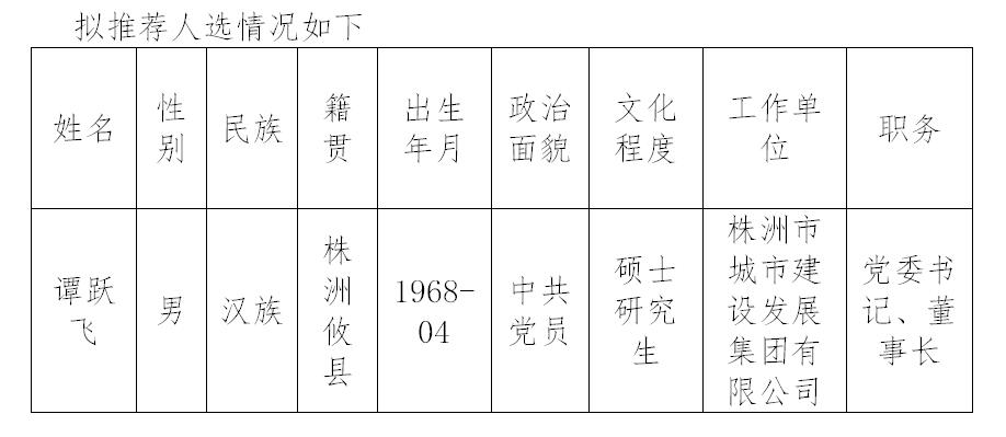 根据《关于评选株洲市2019年劳动模范和先进工作者的通知》株办[2019]75号文件精神,经公司党委研究,拟推荐谭跃飞同志为2019年市级劳动模范参评对象。按照相关规定,现对拟推荐人员进行公示。欢迎广大干部群众反映和举报拟任职人选思想作风、道德品质、工作能力、廉政勤政等方面的情况和问题。举报人可以通过信函举报、电话举报或到受理举报地当面举报。凡来信或来电举报者,必须签署或告知本人真实姓名和工作单位,对匿名信,公示期间一般不予受理;凡来访者要说明真实身份和单位,反映情况后要在来访情况登记表上签名。所举报的问题,必须真实、准确,内容尽量具体详细,并尽可能提供有关调查核实线索。严禁借机造谣中伤,串联诬告。针对举报人,公司会进行严格的保护。