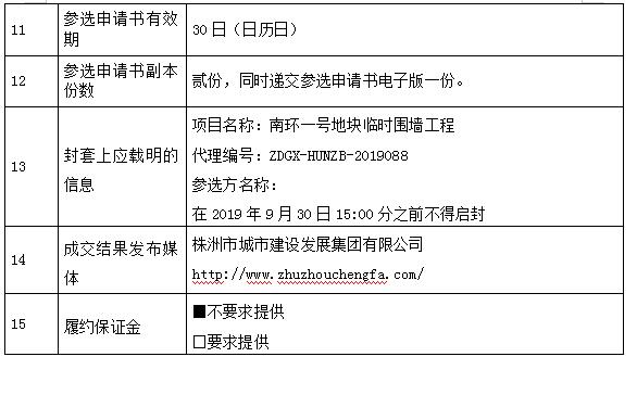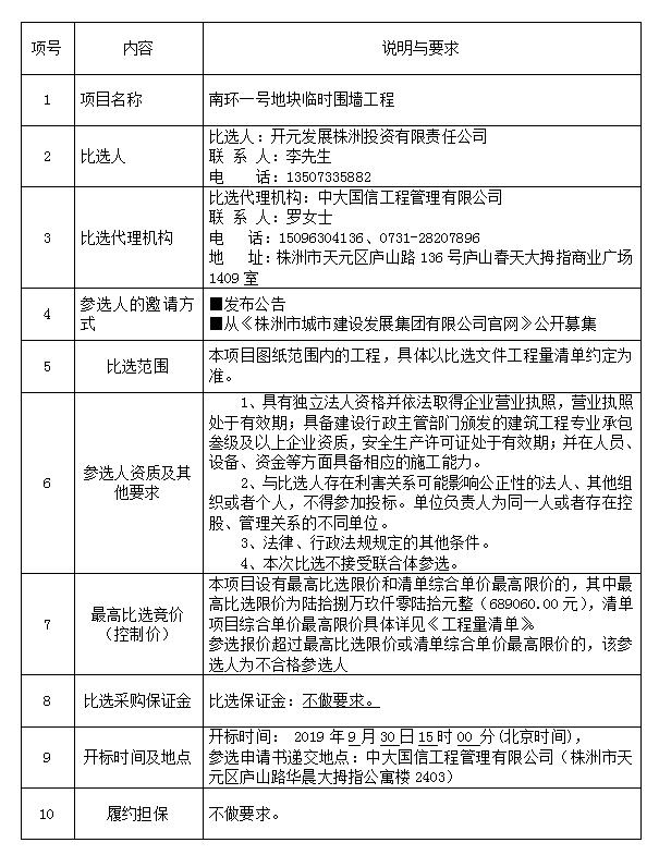 开元发展株洲投资有限责任公司的南环一号地块临时围墙工程,代理编号:ZDGX-HUNZB-2019088进行项目比选,现采用发布公告方式,邀请符合资格条件的参选人参与比选活动。