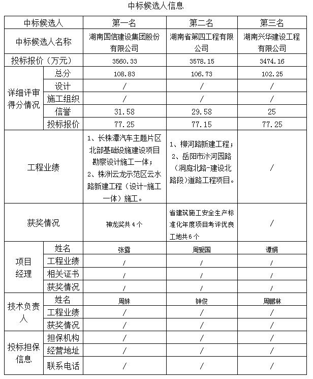 根据招标投标相关法律法规及招标文件的规定,武广新城燕子岭路新建工程施工采用公开招标方式,评标工作已于2019年9月26日在株洲市公共资源交易中心七楼评标室结束,评标委员会推荐了以下3名中标候选人,现将相关信息予以公示。公示期2019年9月27日至2019年9月30日。