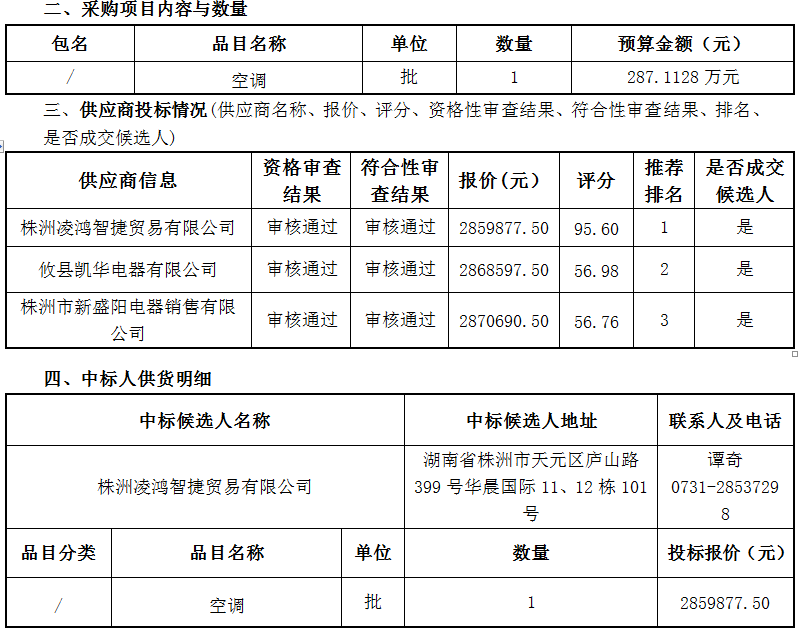 湖南中新工程项目管理有限公司受株洲市武广新城开发建设有限公司的委托,对株洲市二中附小空调采购项目公开招标,经评标委员会评审,采购人确认,现将采购结果公告如下。