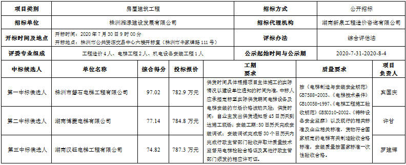 伟德国际betvlctor1946·南洲壹号建设项目一期电梯采购及安装工程于2020 年 7月 30日完成开评标,开评标全程接受株洲市渌口区住房和城乡建设局的监督,评标结果已经招标人确认,中标候选人信息情况如下: