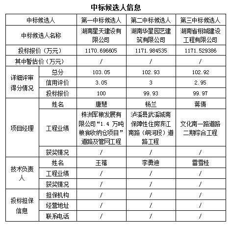根据招标投标相关法律法规及招标文件的规定,武广新城星子坳路(响合路-栗塘路)新建工程评标工作已于2020年8月13日在株洲市公共资源交易中心结束,本项目采用的评标办法为湘建监督[2018]116号文件规定的经评审的最低投标价法,评标委员会推荐了以下3名中标候选人(排序),现将相关信息予以公示。公示期2020年8月14日至2020年8月18日。