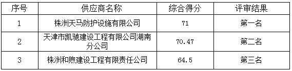 公示内容:株洲市城市公用事业经营有限公司的王家坪立交桥桥下场地租赁项目(重新选聘)内部比选于2020年12月8日在株洲市天元区泰山西路高科汽配园D区11栋3楼大会议室举行,评标委员会按照比选文件确定的评标办法,对所有有效报价方案进行了详细的评阅,经集体充分评议,评审结果为: