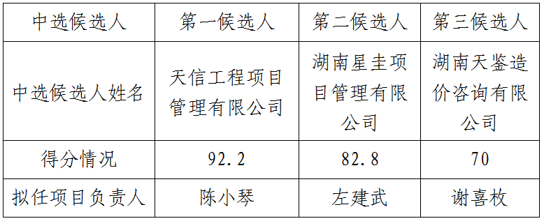 根据公司相关管理办法规定,株洲市武广新城开发建设有限公司武广教育大厦勘察设计施工总承包项目结算审核造价咨询服务比选工作已于2020年12月24日在株洲市武广新城开发建设有限公司会议室结束,本项目采用的评估办法为综合评分法,评审委员会推荐了以下3名中选候选人(排序),现将相关信息予以公示。