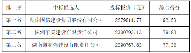 公示内容:根据询比采购文件的规定,株洲市大件垃圾临时处理中心项目施工评审工作已于2021年1月13日在湖南新泉工程造价咨询有限公司评标室结束。评审委员会按照询比采购文件确定的评审办法,对所有有效报价进行了详细的评阅,评委们经过集体充分评议,推荐的中标候选人为: