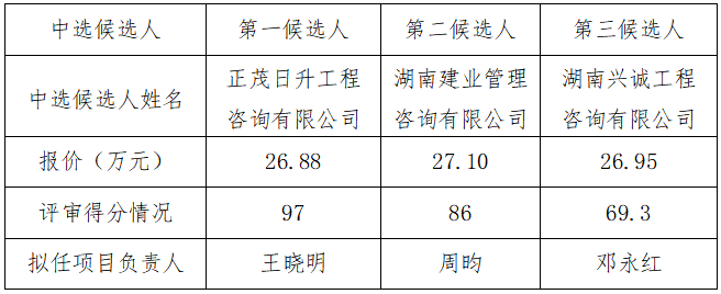 根据公司相关管理办法规定,株洲市伟德国际betvlctor1946建设投资有限公司栗塘路(西站南路-响合路)二标道路及综合管廊新建工程结算审核服务比选工作已于2021年3月19日在株洲市伟德国际betvlctor1946建设投资有限公司2楼会议室结束,本项目采用的评估办法为综合评分法,评审委员会推荐了以下3名中选候选人(排序),现将相关信息予以公示。
