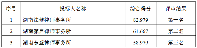 公示内容:株洲市清水塘投资集团有限公司对2021至2022年度常年法律顾问项目进行比选。本次比选于2021年3月29日9时30分(北京时间)在株洲市清水塘投资集团有限公司1楼会议室举行开评标会,评审小组按照比选文件确定的评比办法,对所有有效标书进行了详细的评阅,评审小组经过集体充分评议,结果如下: