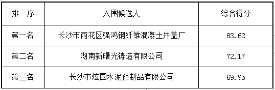 公示内容:根据询比采购文件的规定,2021年度集约管道维护井盖供应商入围单位(重新)询比评审工作已于2021年4月1日在湖南新泉工程造价咨询有限公司评标室结束。评审委员会按照询比采购文件确定的评审办法,对所有有效报价进行了详细的评阅,评委们经过集体充分评议,推荐的入围候选人为: