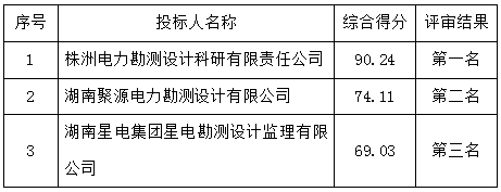 公示内容:株洲市清水塘投资集团有限公司对清水塘科技文化未来中心一期项目送电工程设计进行比选。本次比选于2021年4月7日10时00分(北京时间)在湖南省工程建设监理有限公司会议室举行开评标会,评审小组按照比选文件确定的评比办法,对所有有效标书进行了详细的评阅,评审小组经过集体充分评议,结果如下: