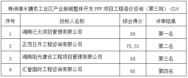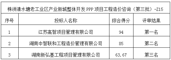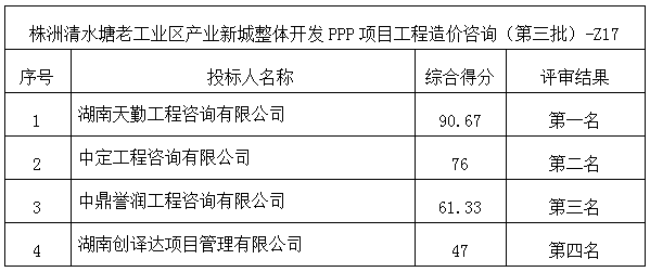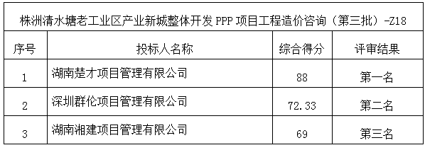 株洲市清水塘投资集团有限公司的株洲清水塘老工业区产业新城整体开发PPP项目工程造价咨询服务机构(第三批)比选公开招标于2021年4月13日评标结束,现将中标结果公告如下: