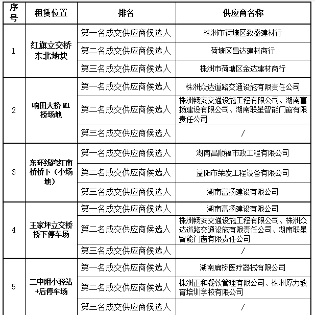 公示内容:株洲市城市公用事业经营有限公司的第一批停车场、地块、驿站租赁项目询比采购于2021年6月8日在株洲市天元区泰山西路高科汽配园D区11栋3楼大会议室举行,评审小组按照询比采购文件确定的评审办法,对所有有效报价进行了详细的评阅,评审结果为: