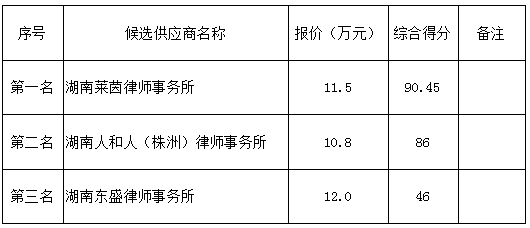 公示内容:新泉工程咨询有限公司受株洲市行政资产经营有限责任公司的委托,对聘请律师事务所处理产权类纠纷项目进行比选。本比选于2021年7月19日上午09:00整在新泉工程咨询有限公司举行开标会及评审会。评审小组按照比选文件确定的评审办法,对所有有效响应文件进行了详细的评阅,评审小组经过集体充分评议,推荐的成交候选人为: