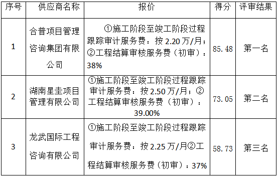 成交金额:①施工阶段至竣工阶段过程跟踪审计服务费:按2.20万/月;②工程结算审核服务费(初审):38%