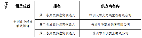 公示内容:株洲市城市公用事业经营有限公司的第二批地块场地租赁项目询比采购于2021年8月12日在株洲市天元区泰山西路高科汽配园D区11栋3楼大会议室举行,评审小组按照询比采购文件确定的评审办法,对所有有效报价进行了详细的评阅,评审结果为: