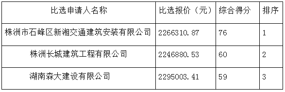 枫溪生态城湘江东岸综合整治二期沿江南路(枫溪大桥-溪三路)新建电力管线工程中选候选人公示公示内容:我公司评审小组于2021年8月20日 分在龙武国际工程咨询有限公司评标室对各投标人的项目比选文件进行评审、评分。评审小组按照比选文件确定的评审办法,对所有有效比选投标文件进行了详细的评阅,评委们经过集体充分评议,推荐的成交候选人为:
