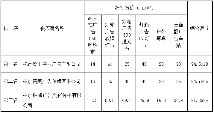 公示内容:根据询比采购文件的规定,广告画面制作、安装与日常维护项目框架协议(重新比选)评审工作已于2021年10月11日在株洲市天元区泰山西路高科汽配园D区11栋3楼小会议室结束。评审委员会按照询比采购文件确定的评审办法,对所有供应商进行了详细的评阅,评审小组经过集体充分评议,推荐的成交候选人为: