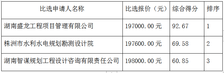 公示内容:我公司评审小组于2021年10月15日下午14:30点整在龙武国际工程咨询有限公司评标室对各投标人的项目比选文件进行评审、评分。评审小组按照比选文件确定的评审办法,对所有有效响应文件进行了详细的评阅,评委们经过集体充分评议,推荐的成交候选人为: