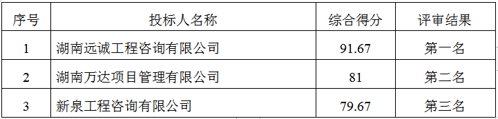 公示内容:株洲市清水塘投资集团有限公司对铜霞路(塘屋路-叶子冲变电站)电力专用综合管廊新建工程(电气、监控部分)结算审核工程造价咨询服务进行比选。本次比选于2021年10月26日9时00分(北京时间)在株洲市清水塘投资集团有限公司1楼会议室举行开评标会,评审小组按照比选文件确定的评比办法,对所有有效标书进行了详细的评阅,评审小组经过集体充分评议,结果如下: