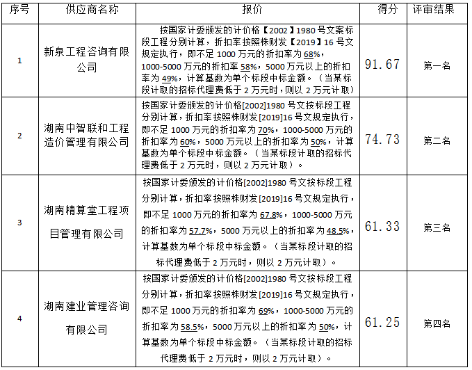 成交金额:按国家计委颁发的计价格【2002】1980号文案标段工程分别计算,折扣率按照株财发【2019】16号文规定执行,即不足1000万元的折扣率为68%,1000-5000万元的折扣率58%,5000万元以上的折扣率为49%,计算基数为单个标段中标金额。(当某标段计取的招标代理费低于2万元时,则以2万元计取)