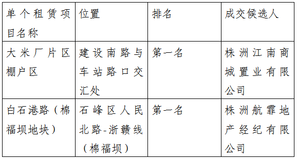 公示内容:株洲市湘江风光带建设开发有限公司零星土地租赁项目询比采购于2021年12月21日在株洲市天元区森林一路悦湖国际1601会议室举行。大米厂片区棚户区、白石港路(棉福坝地块)项目分别有一家单位响应,其他单个租赁项无单位响应。评审小组按照询比采购文件确定的评审办法,对所有有效报价进行了详细的评阅,评审结果如表1、表2所示。