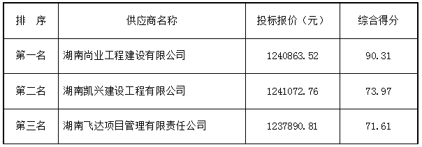 公示内容:根据询比采购文件的规定,株洲市三个中心遗留问题提质改造项目施工评审工作已于2021年12月27日在新泉工程咨询有限公司评标室结束。评审委员会按照询比采购文件确定的评审办法,对所有供应商进行了详细的评阅,评审小组经过集体充分评议,推荐的成交候选人为: