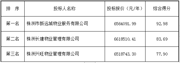 公示内容:根据招标文件的规定,株洲市三个中心现场物业管理项目评审工作已于2022年1月6日在新泉工程咨询有限公司评标室结束。评审委员会按照招标文件确定的评审办法,对所有投标人进行了详细的评阅,评审小组经过集体充分评议,推荐的中标候选人为: