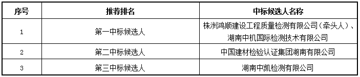 湖南为元建设工程咨询有限公司受株洲市清水塘投资集团有限公司的委托,代理清水塘科技文化未来中心一期项目工程质量检测比选工作。按比选文件的规定,于2022年1月17日下午15:00时在湖南为元建设工程咨询有限公司开、评标室进行了开标、评标。经评标委员会集体评议、业主确认,按综合得分从高至低推荐中标候选人,现予以公示:
