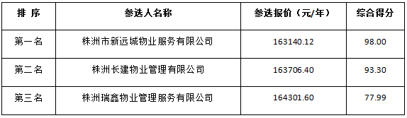 公示内容:根据比选文件的规定,株洲市戴碧蓉爱心大院爱心服务平台空置期物业服务评审工作已于2022年1月18日在株洲市凤溪建设开发有限公司评审室结束。评审委员按照比选文件确定的评审办法,对所有有效参选人进行了详细的评阅,评委们经过集体充分评议,推荐的中标候选人为: