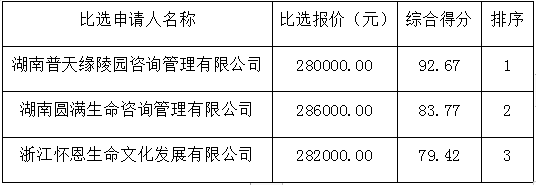 公示内容:我公司评审小组于2022年2月28日16时00分在株洲市灡山生命文化有限公司会议室对各投标人的项目比选文件进行评审、评分。评审小组按照比选文件确定的评审办法,对所有有效比选投标文件进行了详细的评阅,评委们经过集体充分评议,推荐的成交候选人为: