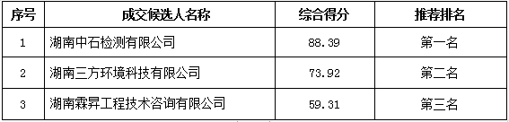 株洲市清水塘投资集团有限公司的清水塘生态新城老工业路(清霞路-清水塘大道)土壤修复和管控工程环境监理及验收采购项目比选于2022年2月22日结束,经评审委员会集体评议、业主确认,按综合得分从高至低推荐成交候选人,现予以公示: