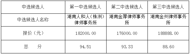 XXX项目清算法律服务机构选聘(第二次)于2022年6月7日上午9:30时,在株洲市清水塘投资集团有限公司进行的开标和评审工作已经结束,评审委员会推荐了以下3名中选候选人(排序),现将相关信息予以公示。公示期2022年6月8日至2022年6月10日。