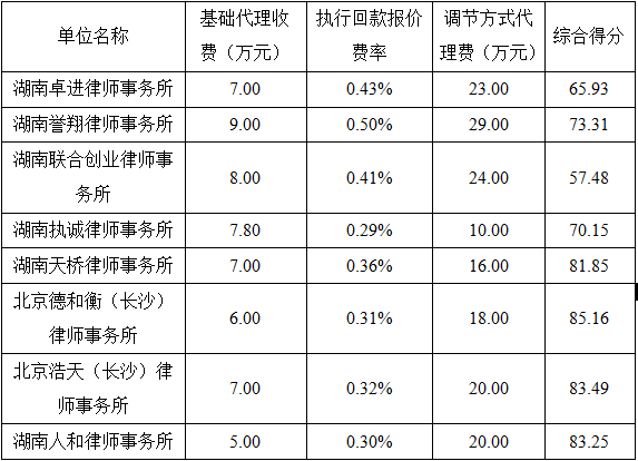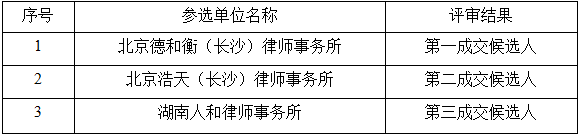 湖南建设工程咨询有限公司受株洲市清水塘投资集团有限公司的委托,代理XXXX诉讼项目法律服务机构选聘比选工作。按比选文件的规定,于2022年6月16日上午9:00时在湖南为元建设工程咨询有限公司开、评标室进行了开标、评标。经评标委员会集体评议、业主确认,按综合得分从高至低推荐中标候选人,现予以公示
